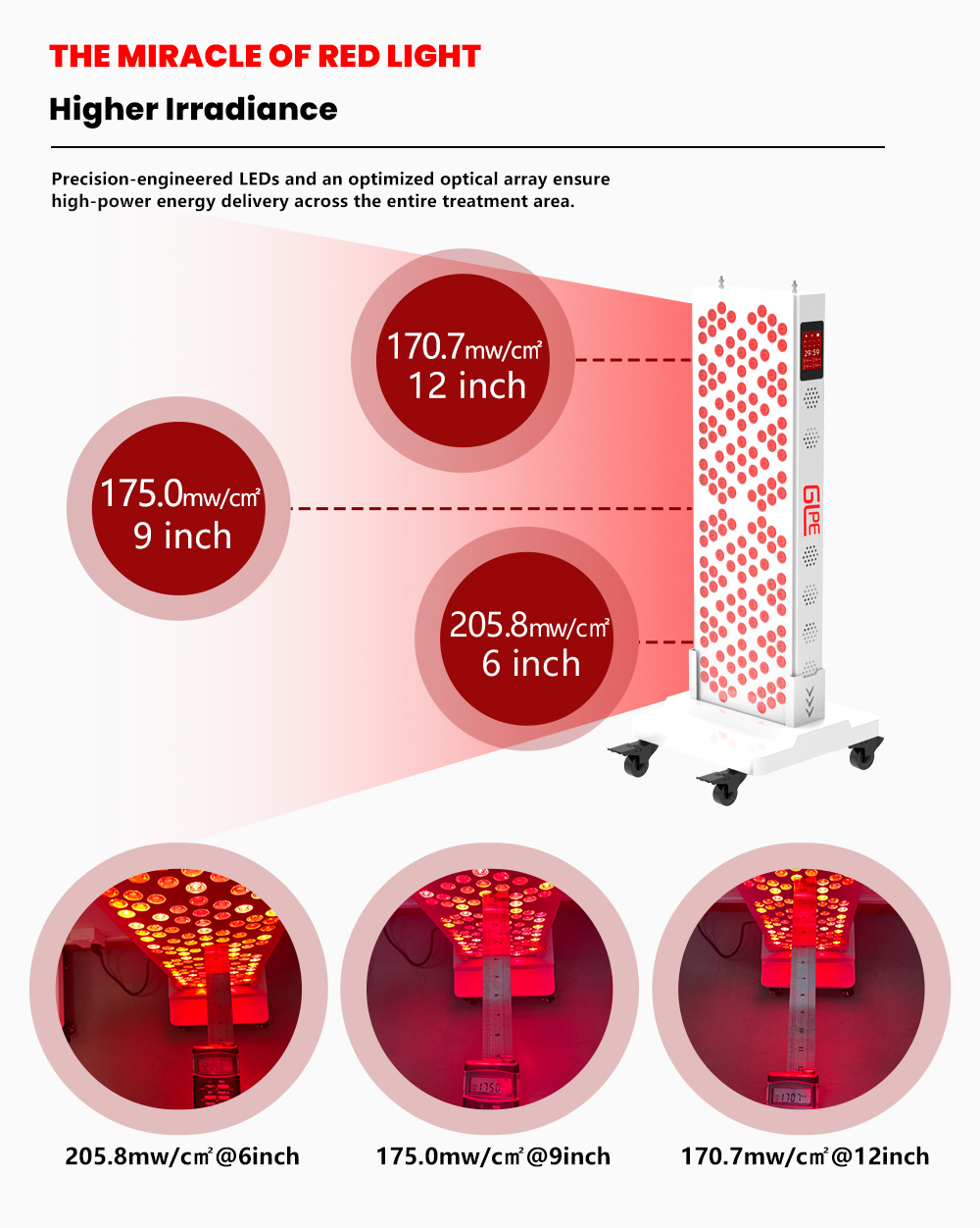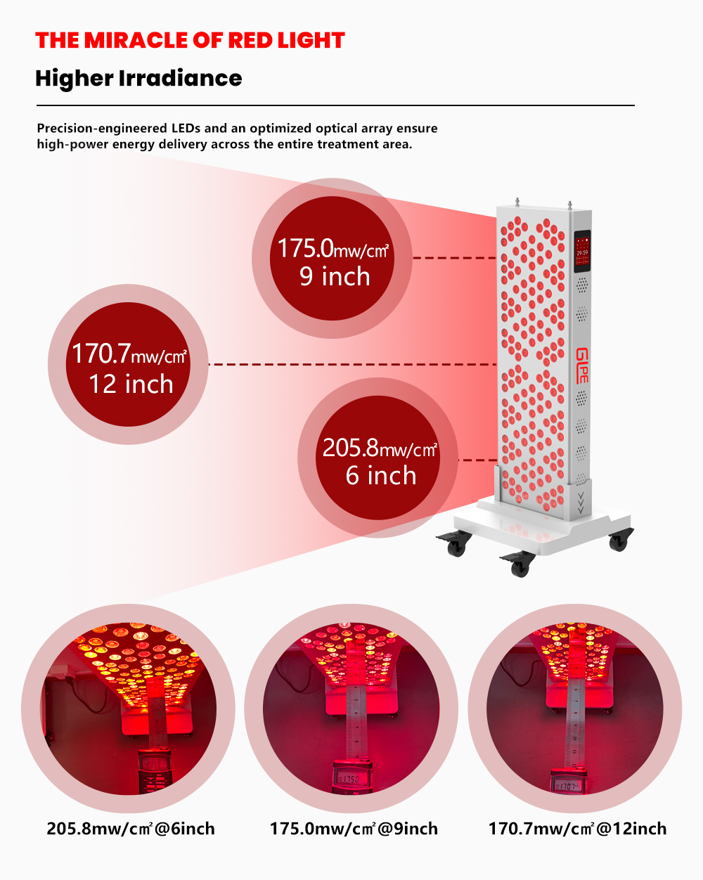 Recommended irradiance ranges between 100-200 mW/cm² for 10-15 minute treatments (at 15-20 cm distance from skin).