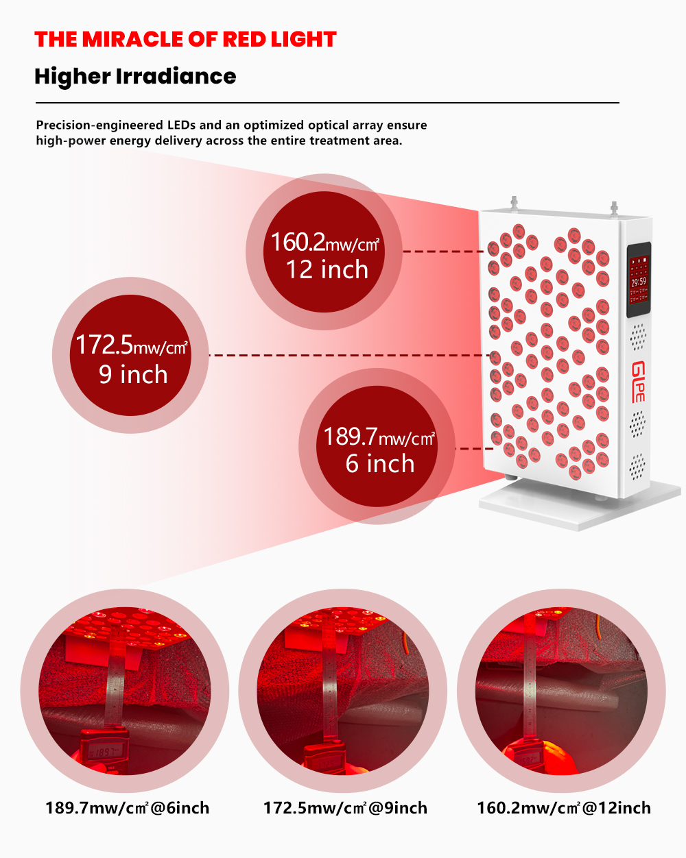 Recommended irradiance ranges between 100-200 mW/cm² for 10-15 minute treatments (at 15-20 cm distance from skin).