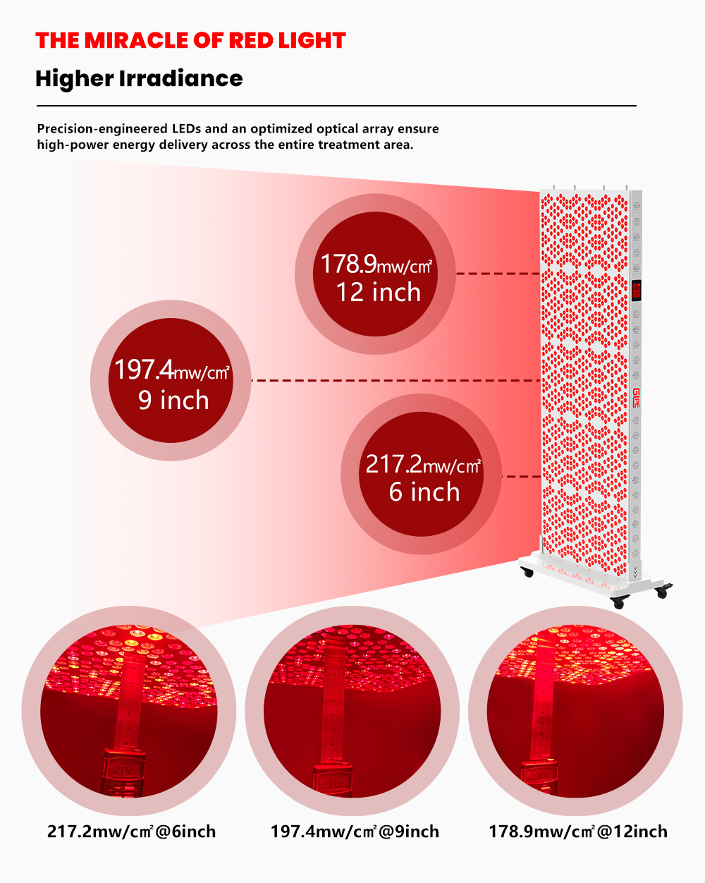 • Recommended irradiance ranges between 100-200 mW/cm² for 10-15 minute treatments (at 15-20 cm distance from skin).