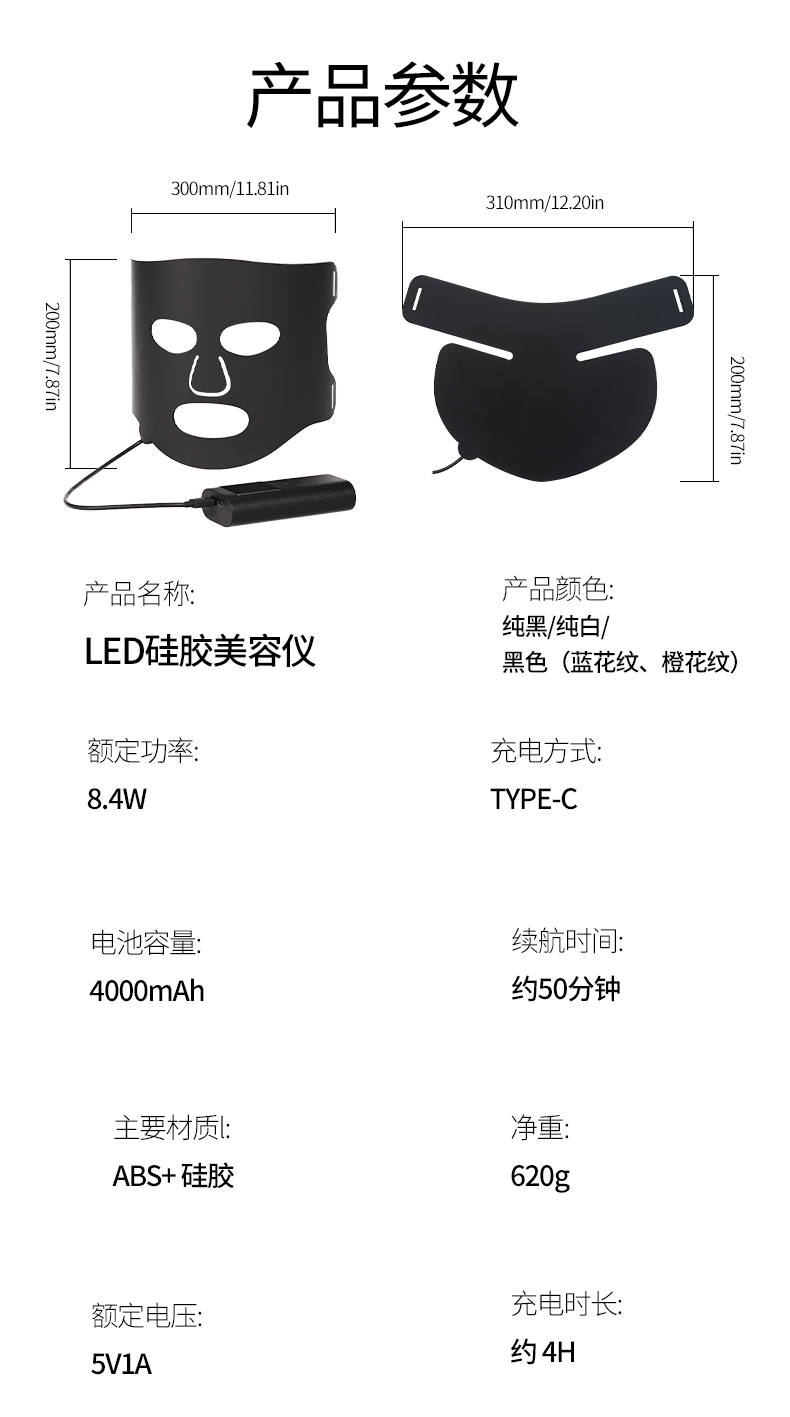 - 配件包含:1个LED面罩(面部+颈部)+固定带+1个移动电源(带控制器)+1份用户手册