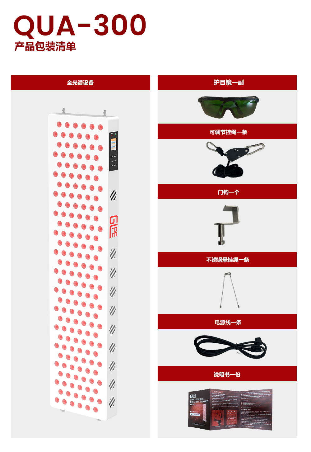 • 包装清单:红光理疗仪主机 × 1、门挂套件 × 1、钢制吊缆 × 1、可调悬挂绳 × 1、电源线 × 1、使用手册 × 1、防护镜 × 1