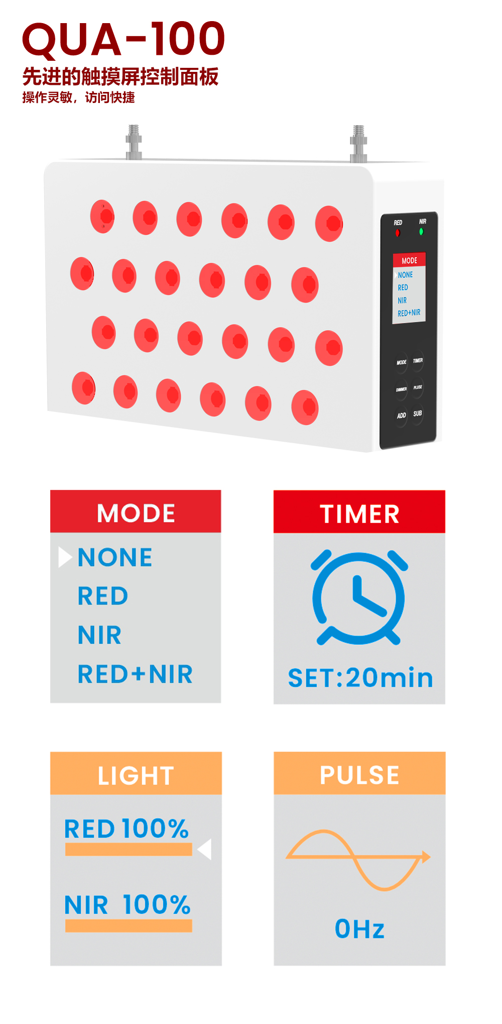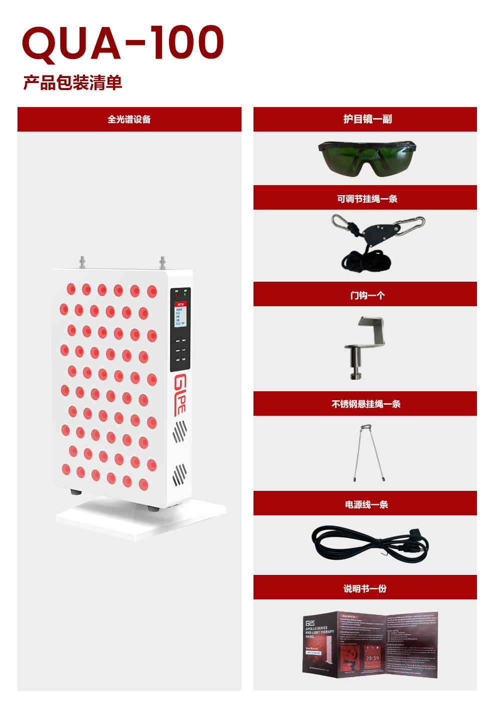 - 630nm:减少皱纹、缓解牛皮癣、促进毛发再生、改善痤疮。660nm:缓解训练疲劳并提高运动表现,与810nm红光交互使用、能够抑制炎症、加速骨质愈合、减轻伤后肿胀、缓解神经性疼痛。