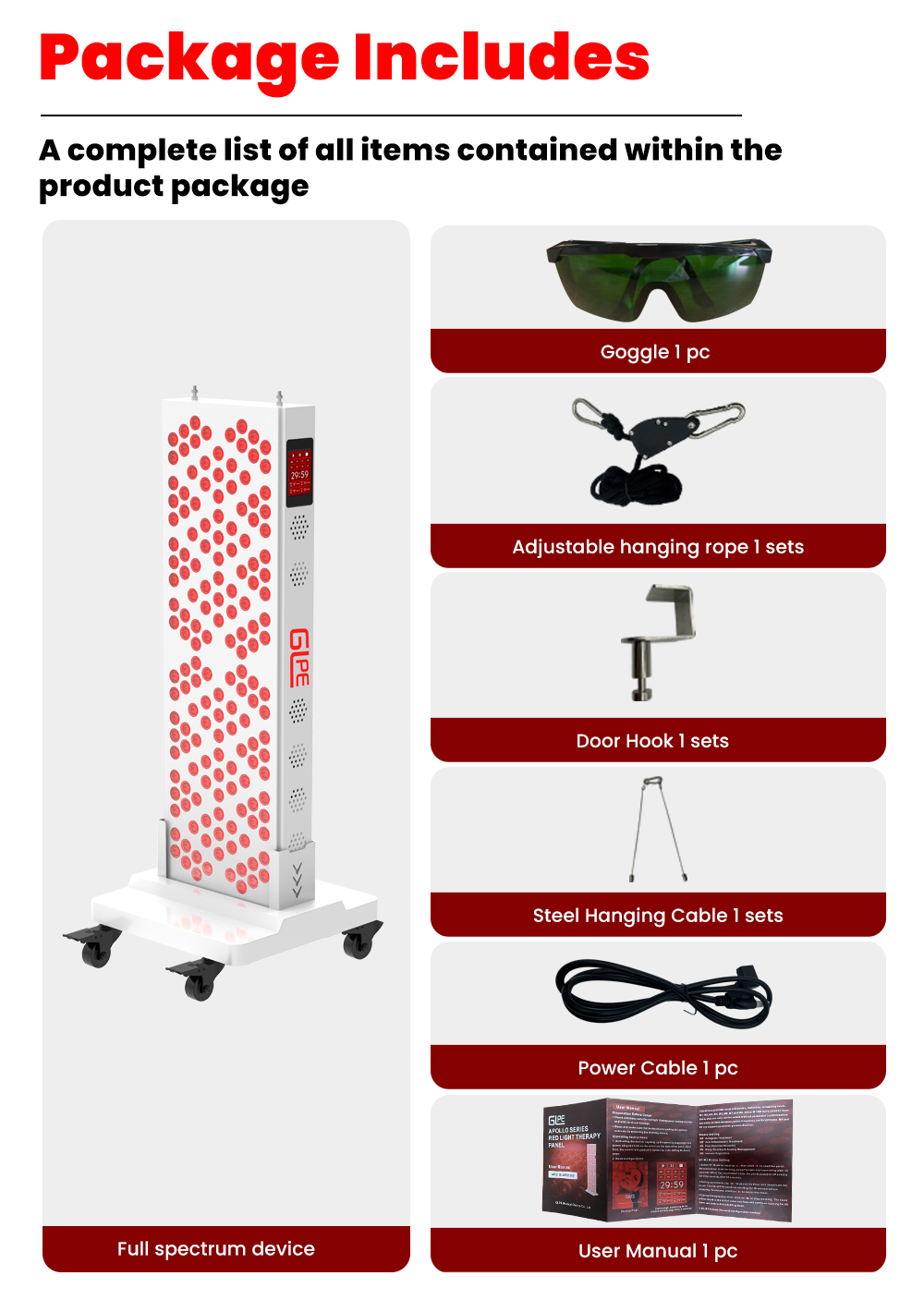 - 包装包含:1盏灯具+ 1根电源插头线+1个门钩 + 1条挂绳 + 1条升降吊绳 + 1本说明书 + 1个墨镜